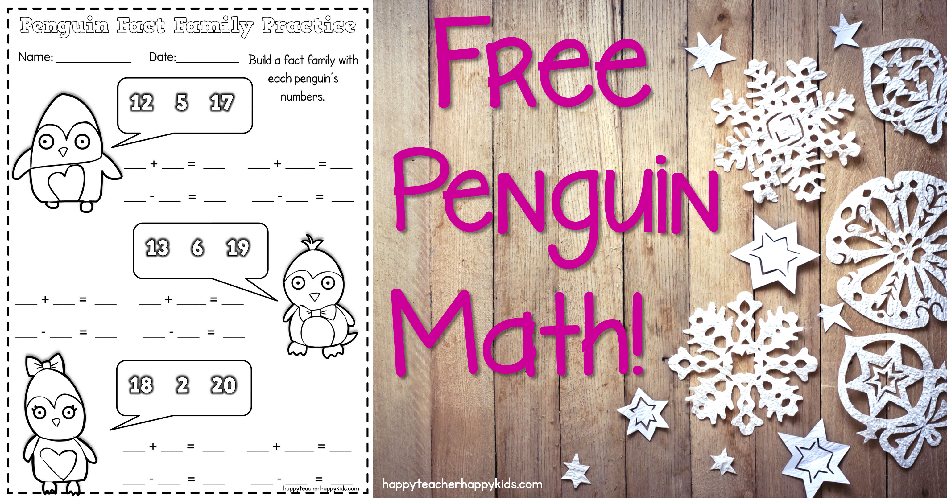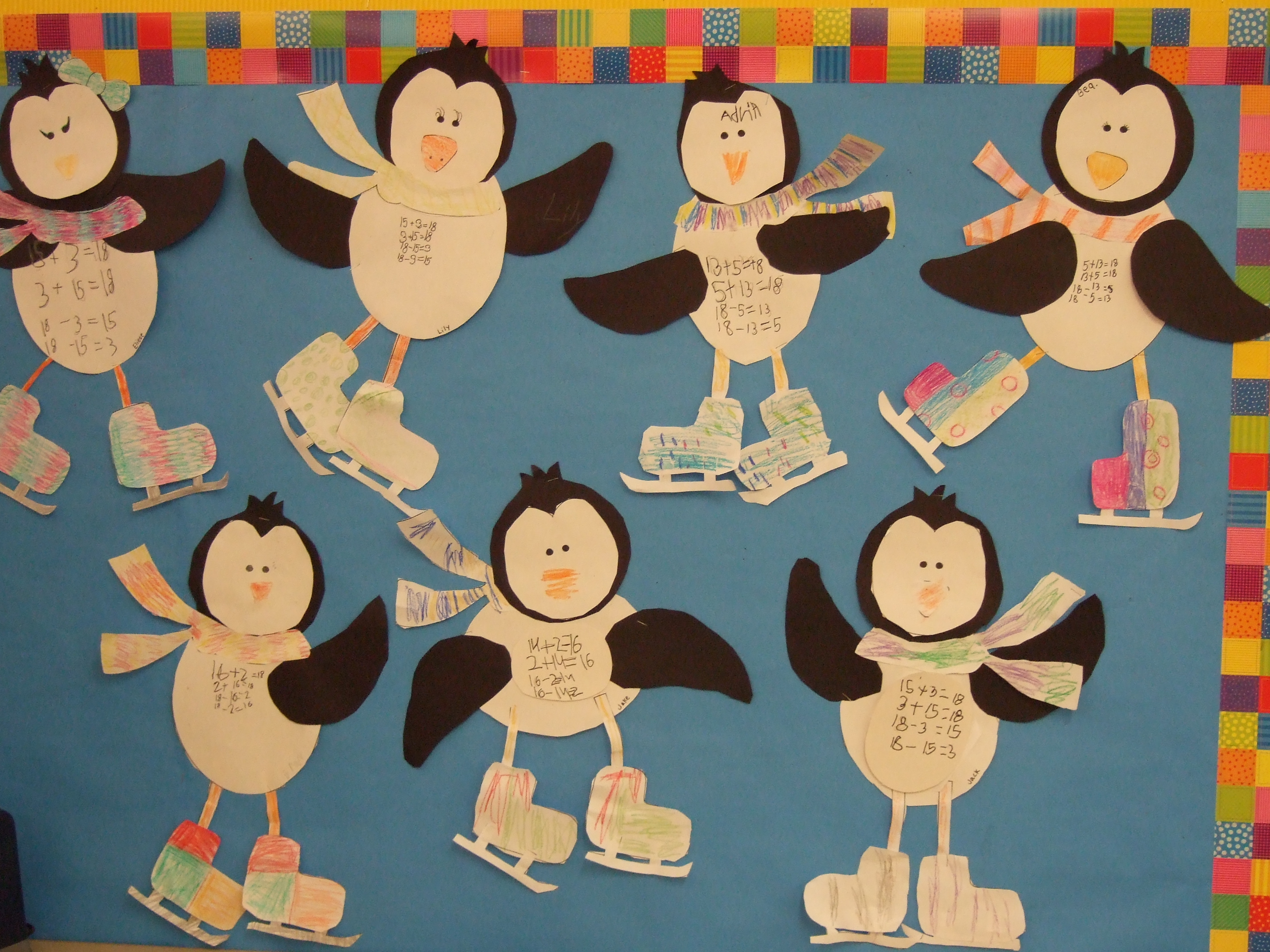 Aren’t these the cutest? After taking down all of my December bulletin boards I was getting depressed by all of the empty walls. I’m glad to finally have something Januaryish up even though it’s just in time to switch to Valentine’s Day- but I’ll celebrate what I can! Now I come in my room and see happy skating penguins thanks to Kendra’s Kindergarten. I knew we had to make these little ice skaters when I saw them in her shop- so we added some first grade business in with a bit of fact family practice.